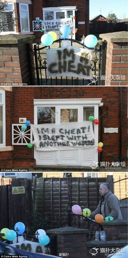 话说,英国一位大姐发现自己的男友与其他女的有染后,便决心报复。她在男友家外挂上彩色气球,并扯了两条横幅,上面写着“我是一个骗子!我睡了别的女人”。