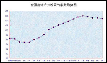 7月份,全国房地产开发景气指数(简称“国房景气指数”)为104.72,比6月份回落0.34点,比去年同期提高6.71点。(图:财经网)