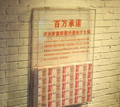 郑州一火锅店内墙上挂有一透明玻璃箱,内装大量现金!箱子上红色字体显示:“为让大家放心,xx火锅郑重承诺:用100万现金作为举报奖金,任何人如发现xx火锅店使用老油,xx火锅将给予举报人100万现金奖励。”