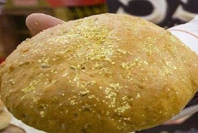 西班牙的一个面包房最近推出了这么一个金箔面包,117欧一个,包含250毫克可食用的金箔。他们表示旅游区里每年都有许多来自阿拉伯、俄罗斯和中国的土豪们……他们总是在找些可让他们炫富的东西,这就是为他们准备的。