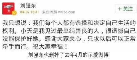 事情是酱紫的:去年四月,刘强东和奶茶妹妹恋情曝光时,刘强东曾发了一条“小天是我见过最单纯善良的人”的微博。1月3日下午,网友发现刘强东删除了那条微博,奶茶MM章泽天也清空了所有微博……