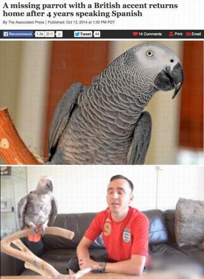 一个英国人有只鹦鹉,那鸟很聪明,说的一口流利的英音。4年前这只鹦鹉飞跑了,直到最近,一个兽医从这只它的微芯片中找到信息重新帮它找回了主人。主人欣喜若狂的去把它接回来之后,鹦鹉一张嘴。简直坑爹!英音没了。改说了一口流利的西班牙语。