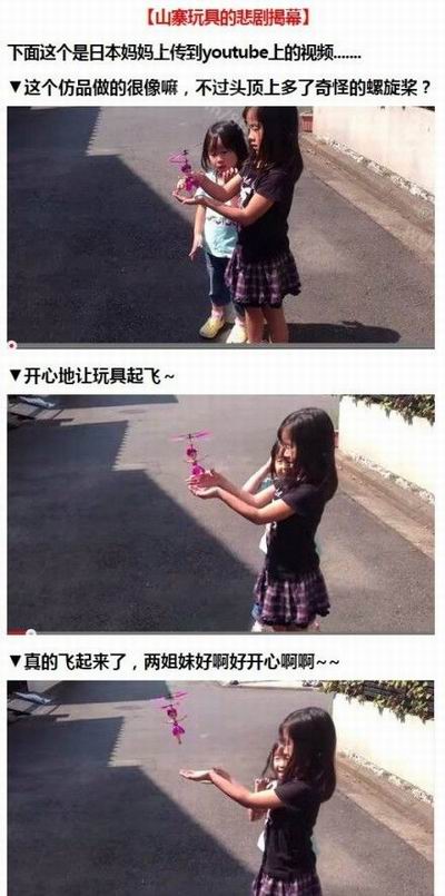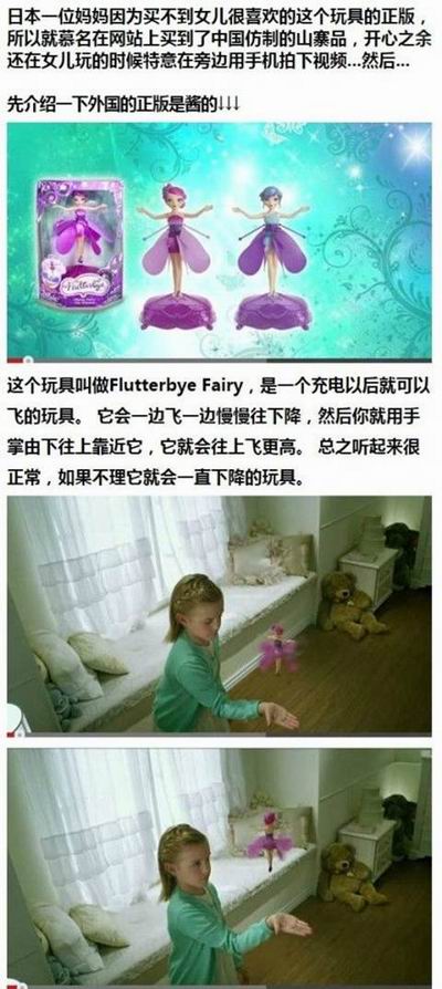 日本一位妈妈因为买不到女儿很喜欢的玩具的正版,所以就慕名去网站上买到了中国仿制的山寨品,开心之余还在女儿玩的时候特意在旁边用手机拍下视频。然后奇迹发生了。(让八卦乱飞)