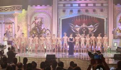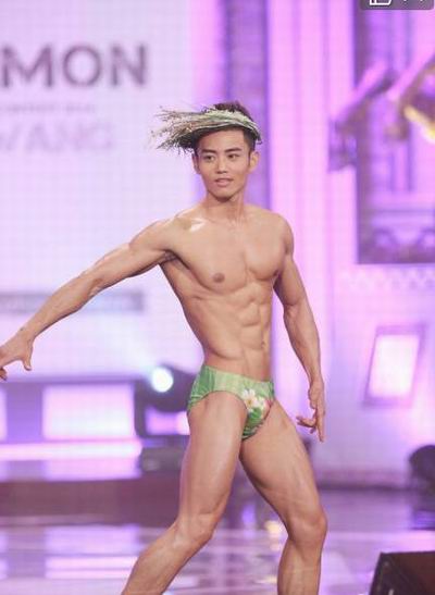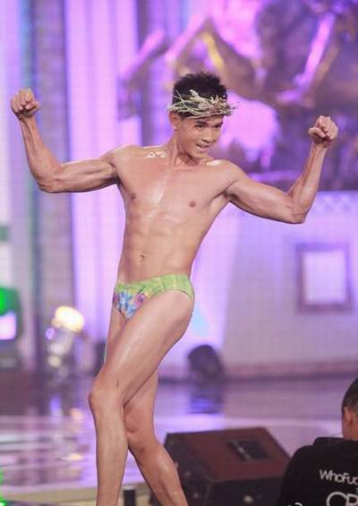 这是2014年亚洲先生总决赛竞选现场。16位亚洲先生逐一出场自我介绍后,以三角泳裤造型亮相,大秀健硕肌肉。