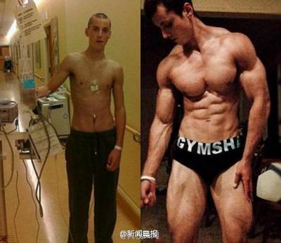 4年前,美国密歇根州20岁男孩扎克患上了霍金淋巴癌,身体孱弱、体重不到90斤。4年来,在家人和女友的鼓励下,扎克每天坚持锻炼,不仅身体越来越强壮,还战胜了病魔!