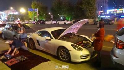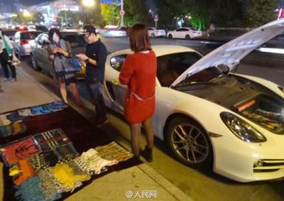 昨天晚上,浙江绍兴一路口,一辆崭新的保时捷跑车停在路边,一小伙子和一红衣姑娘下车,打开引擎盖,将一件件围巾放在路边,打算摆摊叫卖,说是为赚点油钱……