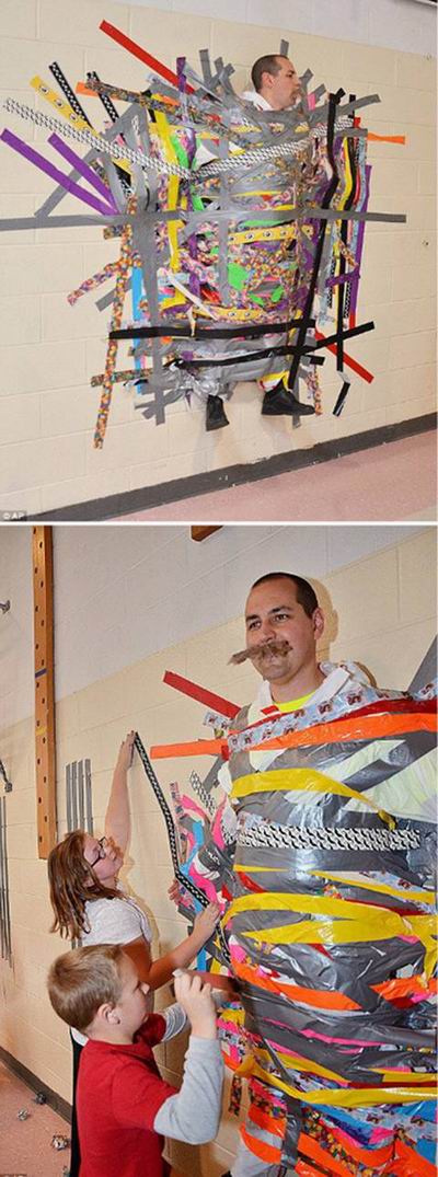 美国科罗拉多小学校长瑞安卡斯特向学生们承诺,如果他们能为小镇秋天的狂欢节卖出1万张票,他就答应让学生们把他粘在墙上。