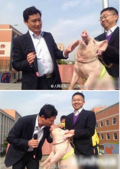 湖北咸宁实验小学副校长洪耀明曾对学生许诺:只要学生不乱丢垃圾,他就当众亲小猪。结果在学校的卫生环境改善后他真的当众亲吻一头小猪。虽然当时他没有征求猪的意见,但他征得了老婆的同意。
