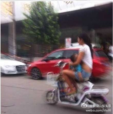 “。。。撩衣为站在电动车前的孩子喂奶。。。。: