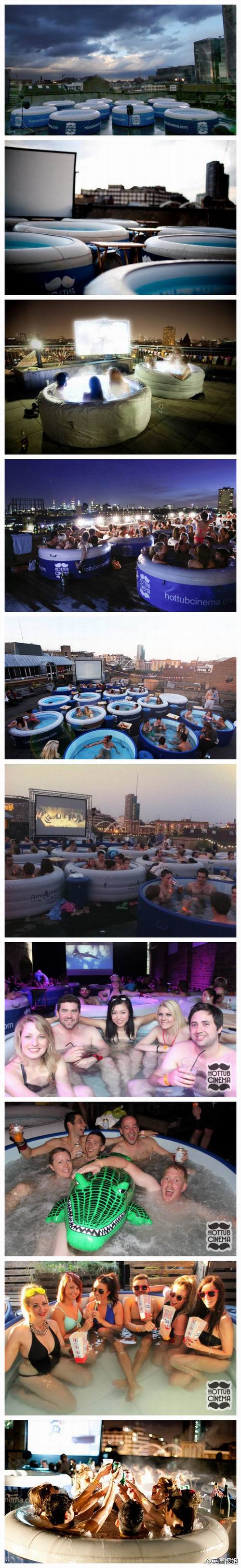 英国现在越来越流行这种泡澡+看电影,商家在楼顶上设大屏幕,然后有几个浴缸,一个缸可以泡8个人,可以相约好友一起边喝啤酒边泡澡,边看电影。。。。。空调稀有的国家也是会玩。。