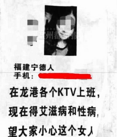 近日,福建女子叶子几乎天天以泪洗面,不敢出门。原来,其家附近的大街小巷电线杆上贴出了数百份内容恶毒的小广告,称其有艾滋病,上面还留有叶子的照片和电话号码。原来是想追求她却被拒绝的一男子所为。。。