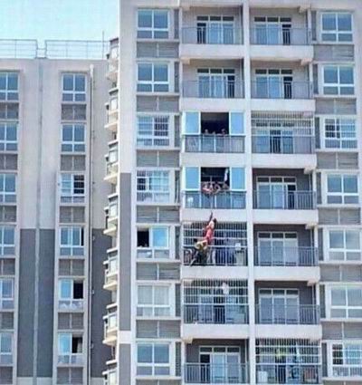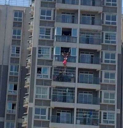 还好她命大,跳下去后她被悬挂在11楼窗户外的护栏上。还好她有位好邻居,11楼的住户徐先生一把抓住了她的脚。随后她被成功解救。