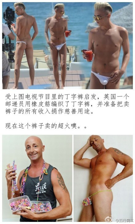 最近有一个英国的邮递员受电视上这种裤子的启发自己用橡皮筋也编织了条丁字裤,据说卖得很火,怎么样,看着大叔那魅惑勾人的眼神是不是也想来一条?