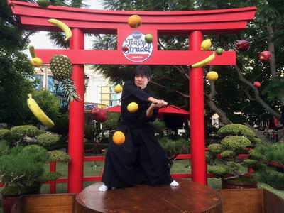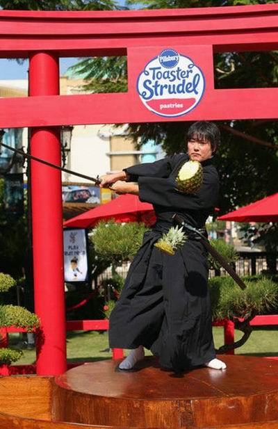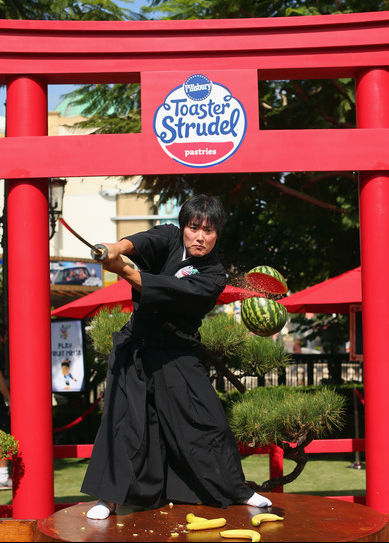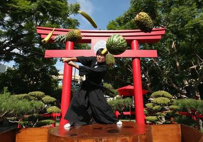 8月13日,美国洛杉矶上演现实版《水果忍者》,由日本剑术高手町井勋现场表演快刀斩水果绝技,看起来很爽的样子。