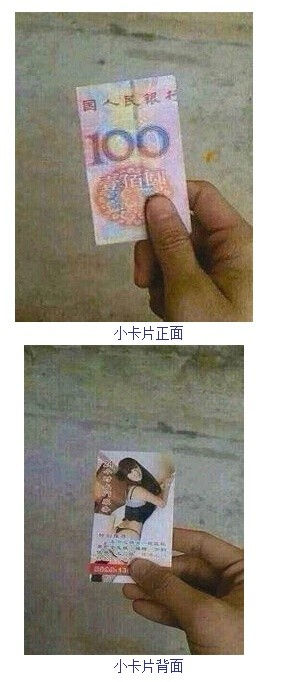 13日上午,一女子在小溪塔十字街附近“丢”了一张百元大钞,民警好心提醒,女子转身就跑。民警捡起钱才发现,该“钞票”正面印百元图案,反面则印着招嫖信息,有美女图、服务范围和电话。