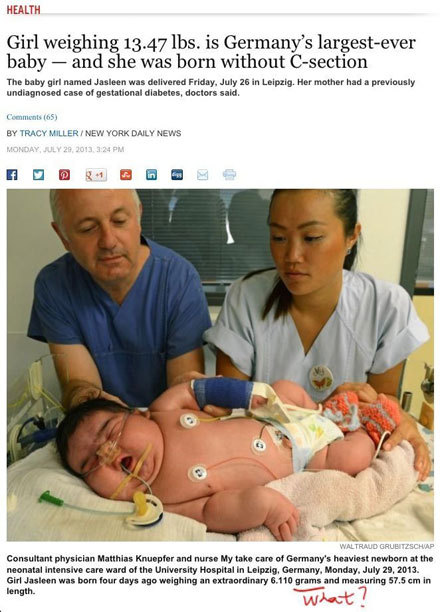 德国某医院接生了重达13磅(6公斤左右),身长57.5cm的婴儿。更惊人的是,这名女婴是顺产。