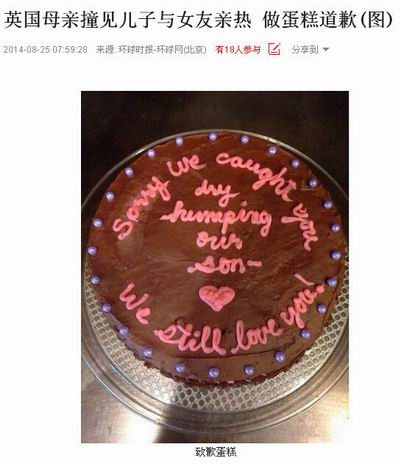 近日,英国一位母亲不慎撞见仍少年儿子在屋内与女友亲热,本来想这真是最破坏家庭幸福的事了。没想到,这位母亲烘烤了一个爱心蛋糕给儿子的女友赔礼道歉,蛋糕上用糖衣拼写着:“对不起,我们撞见了你和我儿子在亲热。我们还是喜欢你的。”
