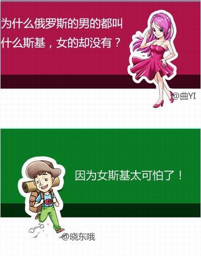 事后,俄国人之间对话如下:瓦西里,刚才那帮娘娘腔美国佬里面,有个穿毛皮大衣的还算是条汉子。