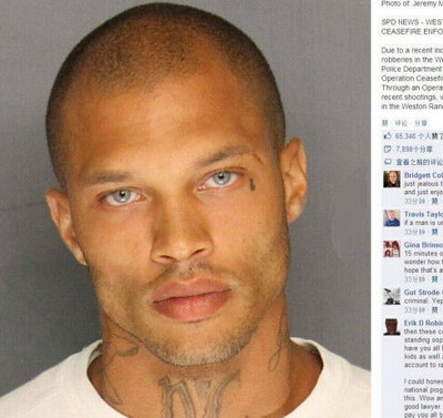 美国加州一男子因涉嫌6项重罪被捕入狱。警察局在其社交媒体账号上公布该嫌犯的入狱照后,因为嫌犯太帅,照片迅速在网络走红。