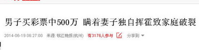 早前一名男子买彩票中500万,但贪心的他没有告诉家人,瞒着妻子独自挥霍,最终导致家庭破裂。