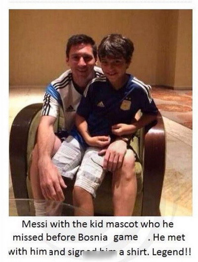 15日,阿根廷与波黑比赛前,梅西与裁判握手,却忽视了从裁判身后跑上前想与其握手的小球童。随后马卡报等大量报道,梅西听说此事后,托人找到小球童道歉,还与他合影并送上签名球衣。