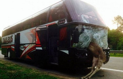 一辆自白俄罗斯首府明斯克前往乌克兰首府基辅的大巴在高速路上行驶途中竟突遭麋鹿迎面撞击。每年的这个时节,这一带的麋鹿都喜欢寻找已发酵的腐烂水果。如食用过多,就可能会出现“吃醉”了的情况。