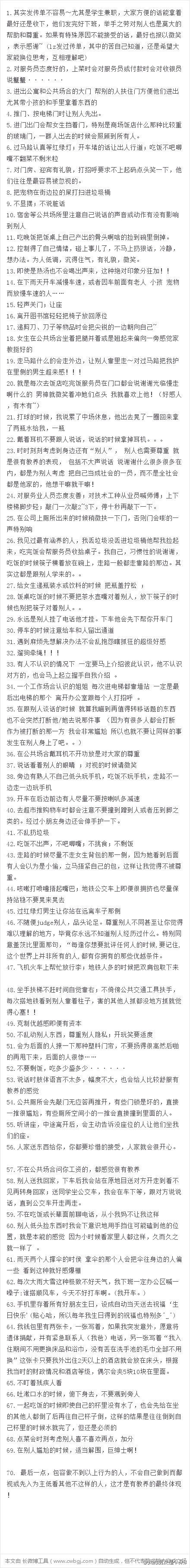 原帖由 镜云先生 于 2014-7-1 11:29 发表 补充: 公共洗手间洗完手之后不要很习惯的甩水··· 男生小便池记得凑近点 临时停车之前考虑下后车的感受,以及是否妨碍别人通过 会车的时候关远光灯 ············· 其实归根结底就一句话:记得 ...