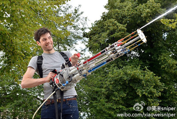 伦敦一名27岁的工程师Alex Bygrave,花费了50个小时,首次设计并制造出全球第一支“加特林式” 转管水枪。 该水枪价值1250英镑(约合13240人民币),射程达到40英尺(超出12米)远、可容纳10公升水,被认为是全世界最为复杂的水枪。