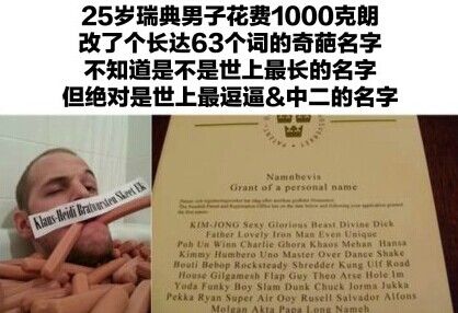 最近,25岁瑞典男子花费1000克朗,改了个超长的奇葩名字。不知道算不算世上最长,但绝对是世上最中二最逗逼最蛇精病……