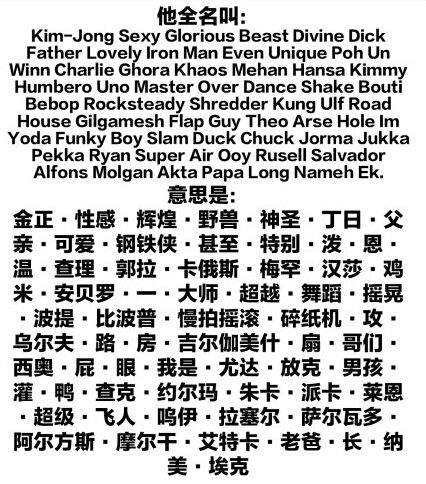 他如今的全名叫:金正·性感·辉煌·野兽·神圣·丁日·父亲·可爱·钢铁侠·甚至·特别·泼·恩·温·查理·郭拉·卡俄斯·梅罕·汉莎·鸡米·安贝罗·一·大师·超越·舞蹈...老爸·长·纳美·埃克。(谷大白话)