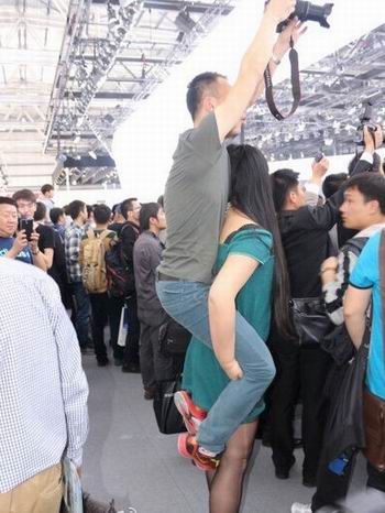 也是北京车展,最近惊现罕见一幕,一女汉子竟然背起男友拍照。不知道男友是不是拍的车模呢?不管怎样,女友值得一赞!