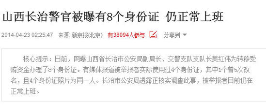 山西长治市公安局副局长樊红伟,最近被举报“为转移巨额赃款,先后在屯留县、长子县、长治县公安机关办了8个假身份证件”。公安厅纪检部门将介入调查。