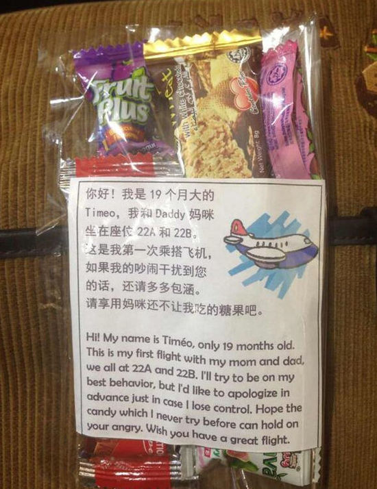 朋友坐飞机,前面的一对父母给的。(falconzy)很感动。