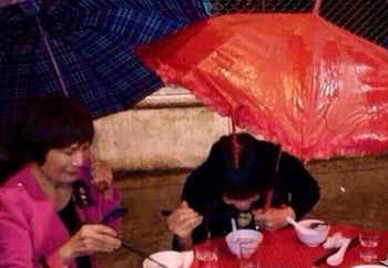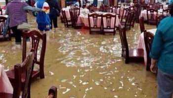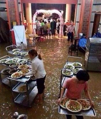 5月8日晚,广东中山一对新人结婚时遇到瓢泼大雨。婚宴现场灌入近50厘米深的洪水,众亲友坚持打伞吃喜宴。