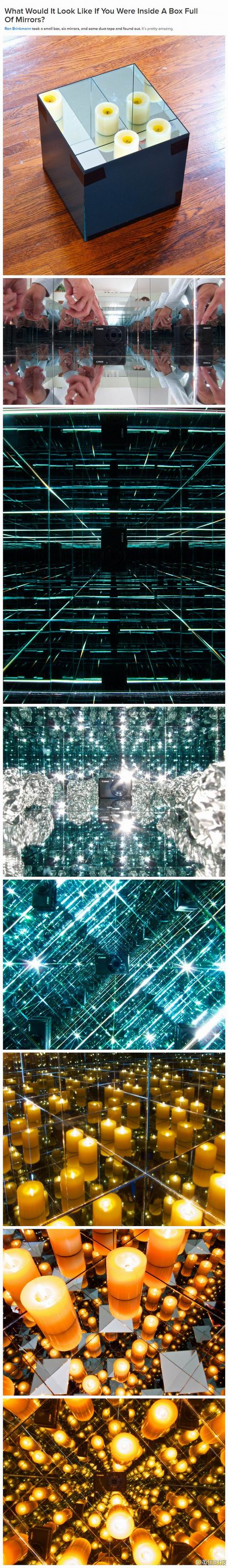 如果一个屋子里全是镜子到底是什么效果,一哥们做了个小盒子,盒子6面都是镜子,然后模拟了全屋都是镜子的效果。。有点酷炫