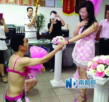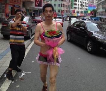 14日,东莞一男子穿比基尼向女友求婚成功。男子是水电工,离过婚儿子都24了。女友30岁海归,有家族企业年薪数十万,跟男子提的条件是:要求婚,就先穿着女人的内衣在大街上走一趟!于是。。。