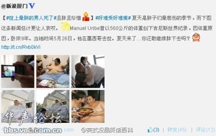 这是一条令人悲痛的新闻:世上最胖的男人,Manuel Uribe,曾以560公斤的体重创下吉尼斯世界纪录,当地时间5月26日,在墨西哥去世。
