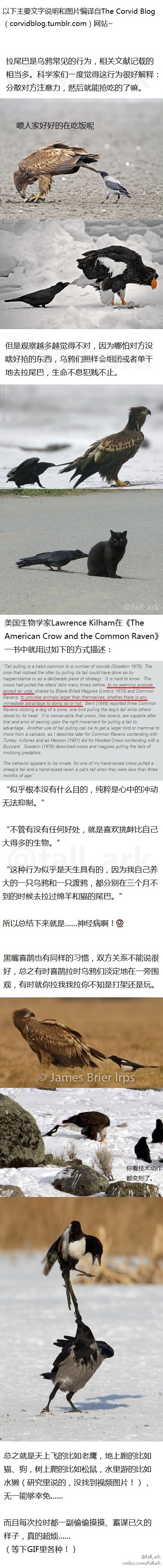 乌鸦有一种比较犯贱的行为叫做“拉尾巴”(tail pulling),一度被认为是干扰对方注意力来抢夺食物的策略。但后来科学家们发现,它们可能纯粹就是爱这么玩而已…………