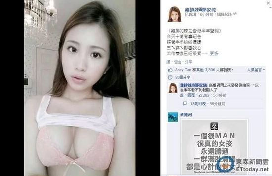 据台湾媒体报道,一向语不惊人死不休的“鸡排妹”郑家纯2月28日晚间在脸书上传E奶照,更发表8言打油诗,她说因为“工作养家已经很累,需要专心努力打拼”,将告别脸书半年。