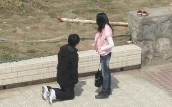 这时男生单膝跪下,把戒指戴在了姑娘的手上:“既然是你要我跪的,那你就得答应嫁给我喽。”