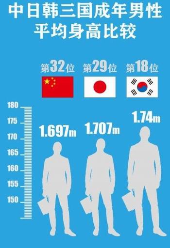 近几年世界男性平均身高,韩国平均1.74米;日本平均1.707米;而中国仅1.697米。7岁到17岁的中国男孩平均身高比日本同龄男孩矮【2.54cm】。