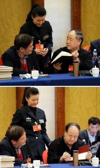 全国政协文艺界委员小组讨论会,祖英姐姐利用会议间隙,将一本画册递给莫言,请求签名。