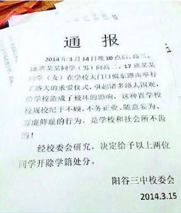 阳谷县一名高三学生在身上浇上汽油、手拿刀子,意图自杀,被学校工作人员和民警拦了下来。据了解,这名男生因14日晚自习后,在校门口用彩灯组成“心”形图案,向一名高二女生公开表白,两人15日被学校开除学籍。