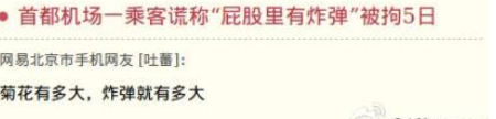 昨日一名男旅客不住抱怨安检慢,当安检员让其脱鞋时,他说:“要不要我把裤子也脱了,我屁股里有炸弹!”安检员立即向他核实说了什么,该旅客再说“ 【屁股】里有炸弹!”
