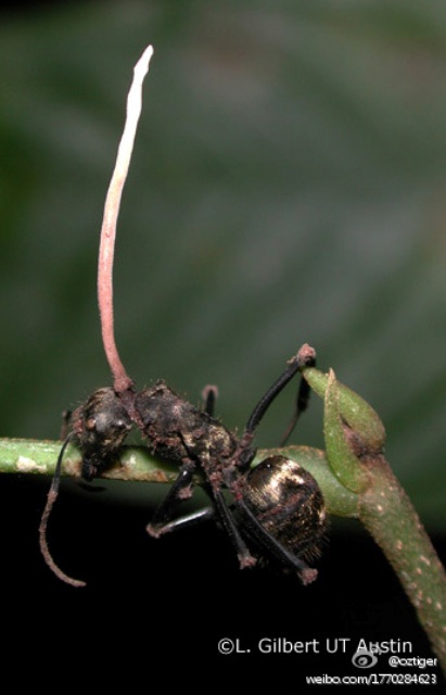这个图则是倒霉的蚂蚁被一种真菌感染。真菌长好后会控制蚂蚁的神经系统,将其象开车一样开到植物顶端,逼其用口钳咬住叶茎定位停好后杀掉。然后长出来爆掉,释放孢子再感染其他蚂蚁。其实冬虫夏草就是真菌感染的蝙蝠蛾幼虫,是gene传播;而相信‘冬虫夏草是大补品’的人则是被中医病毒感染了的白痴。