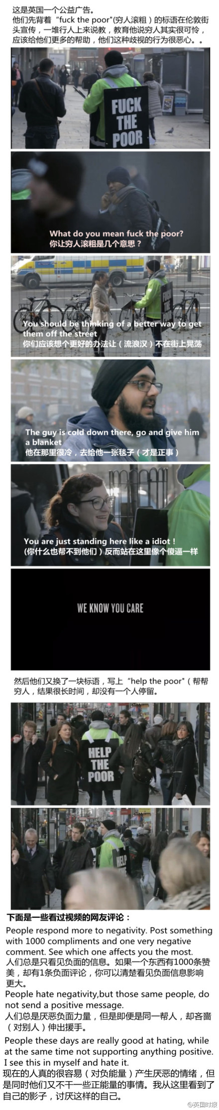 英国时报:英国一个公益广告,看完有点感悟,也许这就是网上负能量消息总能传播的很快,谩骂声一片,而正能量却很快被人忘怀的原因吧