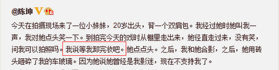今天在拍摄现场来了一位小妹妹,20岁出头,背一个双肩包。我经过她时她叫我一声,我对她点头笑一下。到拍完今天的戏时从棚里走出来,她径直走过来,没有笑,问我可以拍照吗。我说等我卸完妆吧。她点点头。之后,我和她合影,之后,她用砖头砸碎了我的车玻璃。因为她说她曾经是我影迷,现在不支持我了。(陈坤)