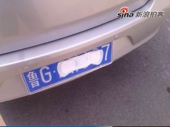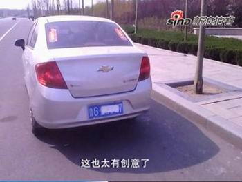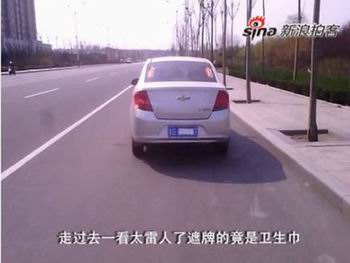 山东潍坊某中学门前停着一部小车,后车牌被一白色物体遮住,行近一看,竟然是卫生巾!天雷滚滚啊!!!