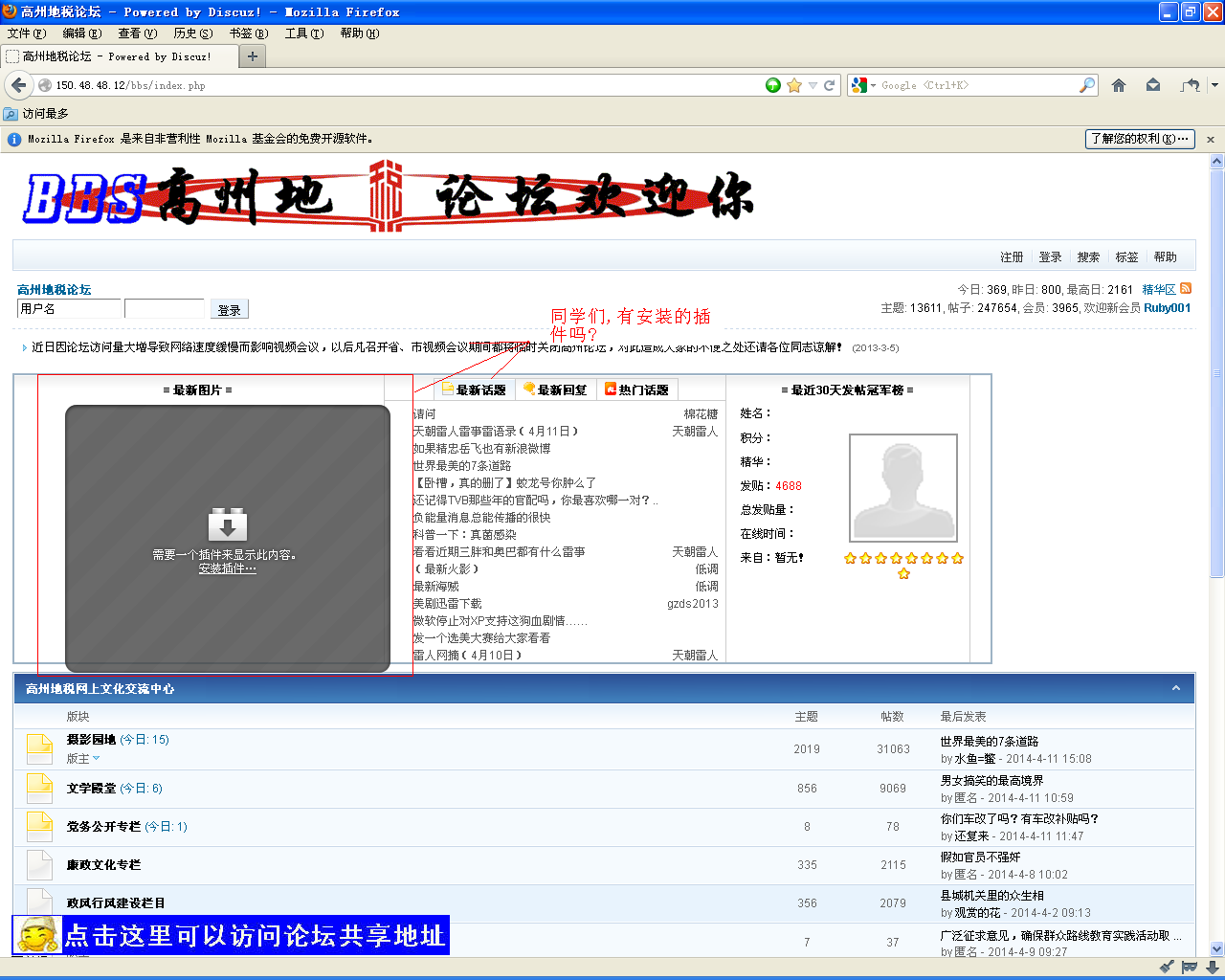 这个要上外网才可以安装插件的,安装那个插件只是用来随机显示某个帖子里面的某张图片的,这个功能没什么意义,不安装也不影响看帖、发帖,我就没得闲安装。