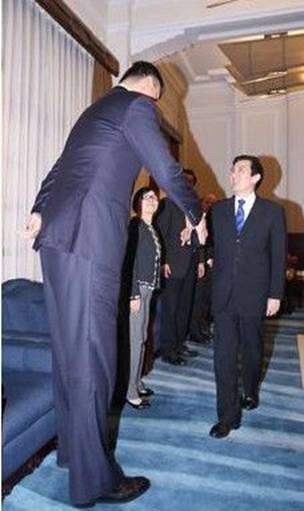 人间有真情,人间有真爱,前两天,马英九接见姚明,身高1米78的马英九在与2米26姚明握手时的画面,很有趣。